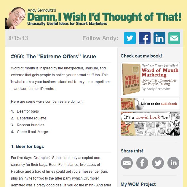 Ever see a company do something awesome and say “Damn, I wish I'd thought of that?” We say it all the time. Thankfully Andy Sernovitz puts together awesome word-of-mouth marketing ideas (that we all wish we thought of) and sends them out each week.