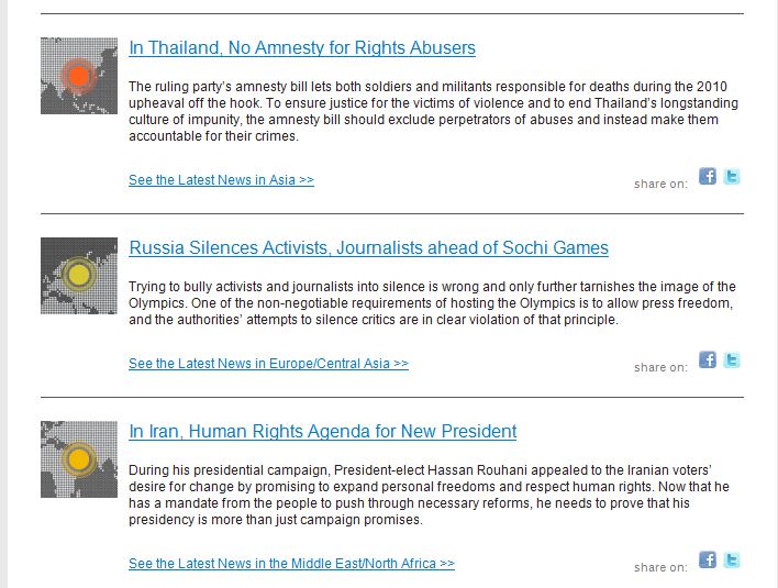 Great content and simplicity go far, especially if you’re looking for industry info. Human Rights Watch entices a friend of mine with their image map-- this is a great example of showing their global impact rather than telling about it.