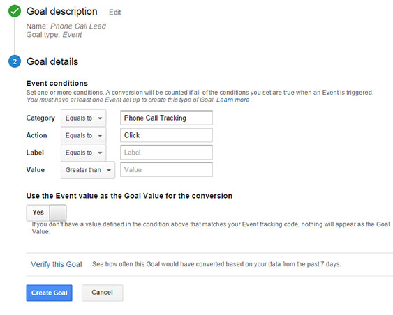 If an Event represents a clickable action like watching a video or clicking a phone number, then what is a Goal? Goals are a way to measure how well your website meets your objectives. For instance, if that Event (clicking a phone number) leads to a conversion.